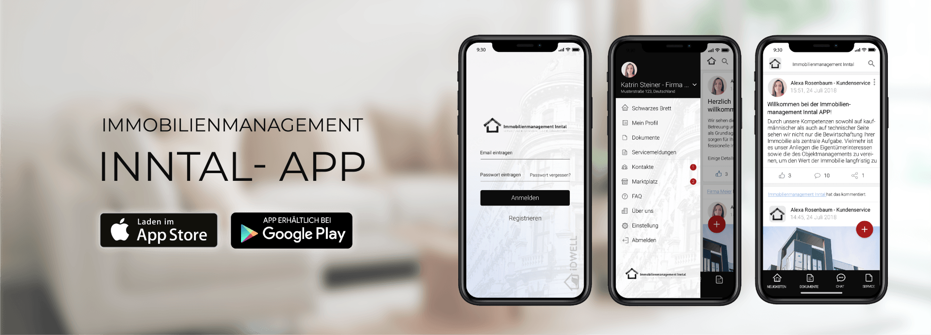 - Ihre Mobilität und Zeitersparnis stehen im Fokus. Informieren Sie sich zu jeder Zeit und an jedem Ort rund um Ihre Immobilie auf der Immobilienmanagement Inntal App powered by iDWELL.